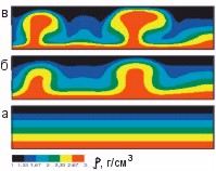С появлением мощных компьютеров появилась возможность численного моделирования геодинамических процессов в рамках классической гидродинамики. Как и в случае термальной модели, в первом приближении можно использовать однородную ньютоновскую жидкость для РТ-условий подъема и остывания пород группы 3 на рис.2. Анализ такого моделирования дан в специальной работе (3). Здесь же заметим, что заданная вязкость пород варьировала в пределах 1019 - 1020 пуаз, а градиент плотности не превышал 0.7 г/см3. Моделирование проводилось по специально разработанной на основе метода конечных элементов программе DIAPIR с помощью рабочей станции SUN для бесконечного по простиранию разреза. Химическое взаимодействие между слоями при этом не рассматривалось.