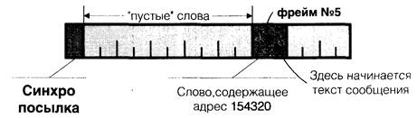 Для передачи адреса пейджера применяется следующее правило. Все пространство адресов делится на 8 групп, нумеруемых от 0 до 7. Фреймы внутри блока также нумеруются oт 0 до 7. Адрес пейджера делится на 8. Остаток от деления дает номер фрейма, в котором пейджер будет искать свой адрес. В этом фрейме либо в первом, либо во втором слове передается результат деления. Bceпредыдущие фреймы этого блока заполняются специальными 32-х битными последовательностями-"пустыми" словами (01111010100010011100000110010111). Сразу же после передачи адреса начинается передача собственно сообщения.
