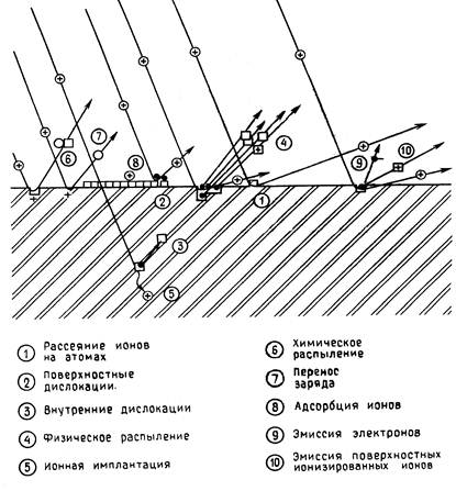 Фиг.1. Виды взаимодействий ионов с твердым телом (2).
