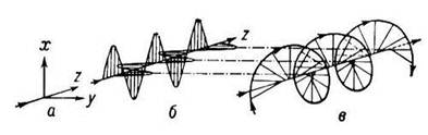 z – направление распространения волны (а); б и в – мгновенные изображения колебаний