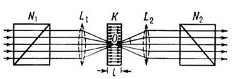(N1 - поляризатор, N2 - анализатор; К - пластинка толщиной l, вырезанная из одноосного двулучепреломляющего кристалла параллельно его оптической оси; L1, L2 - линзы)