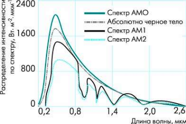 На рис.1 показано спектральное распределение интенсивности солнечного излучения в различных условиях. Верхняя кривая (АМ0) соответствует солнечному спектру за пределами земной атмосферы (например, на борту космического корабля), т.е. при нулевой воздушной массе. Она аппроксимируется распределением интенсивности излучения абсолютно черного тела при температуре 5800 К. Кривые АМ1 и АМ2 иллюстрируют спектральное распределение солнечного излучения на поверхности Земли, когда Солнце в зените и при угле между Солнцем и зенитом 60°, соответственно. При этом полная мощность излучения – соответственно порядка 925 и 691 Вт/м2. Средняя интенсивность излучения на Земле примерно совпадает с интенсивностью излучения при АМ=1,5 (Солнце – под углом 45° к горизонту).