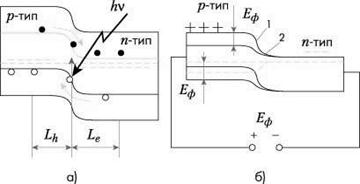 Когда СЭ освещается, поглощенные фотоны генерируют неравновесные электрон-дырочные пары. Электроны, генерируемые в p-слое вблизи p-n-перехода, подходят к p-n-переходу и существующим в нем электрическим полем выносятся в n-область. Аналогично и избыточные дырки, созданные в n-слое, частично переносятся в p-слой (рис. 3а). В результате n-слой приобретает дополнительный отрицательный заряд, а p-слой – положительный. Снижается первоначальная контактная разность потенциалов между p- и n-слоями полупроводника, и во внешней цепи появляется напряжение (рис. 3б). Отрицательному полюсу источника тока соответствует n-слой, а p-слой – положительному.