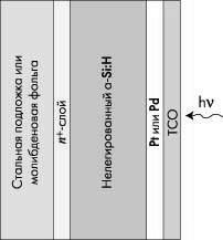 При нанесении аморфного кремния на металлическую подложку образуется нежелательный потенциальный барьер а-Si:Н/металлическая подложка, высоту которого необходимо уменьшать. Для этого используют подложки из металлов с малой работой выхода (Mo, Ni, Nb). Перед нанесением аморфного кремния желательно осадить на металлической подложке тонкий слой (10–30 нм) а-Si:Н, легированный фосфором. Не рекомендуется использовать в качестве материалов электродов легко диффундирующие в аморфный кремний металлы (например, Au и Al), а также Cu и Ag, поскольку а-Si:Н обладает плохой адгезией к ним. Отметим, что Uxx солнечных элементов с барьером Шотки на основе а-Si:Н обычно не превышает 0,6 В.