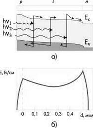 Рис.7. Энергетическая зонная диаграмма p-i-n-структуры (а) и расчетное распределение электрического поля (б) |