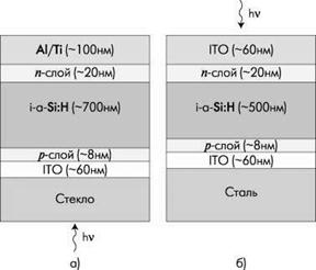 Рис.8. р-i-n-Структура на стеклянной (а) и стальной (б) подложке |