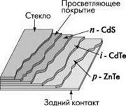 Подобно CuInSe2, наилучшие элементы на основе CdTe включают гетеропереход с CdS в качестве оконного слоя. Оксид олова используется как позрачный контакт и просветляющее покрытие. Серьезная проблема на пути применения CdTe – высокое сопротивление слоя p-CdTe, что приводит к большим внутренним потерям. Но она решена в p-i-n-структуре с гетеропереходом CdTe/ZnTe (рис. 10).