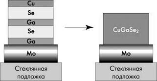 CuGaSe2 также весьма интересен как тонкопленочный элемент солнечных батарей. Благодаря запрещенной зоне шириной 1,68 эВ он используется как верхний элемент тандемной солнечной батареи с нижним элементом из CuInSe2. Слои CuGaSe2 формируют путем последовательного осаждения термическим испарением тонких слоев Ga, Se и Cu на поверхность стеклянной подложки, покрытой слоем молибдена толщиной 1 мкм (рис.11). Далее из полученной структуры в установке быстрого термического отжига в течение пяти минут при температуре 550°С получают соединение CuGaSe2.