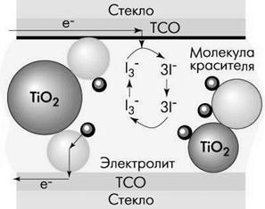 Принцип работы элемента основан на фотовозбуждении красителя и быстрой инжекции электрона в зону проводимости TiO2. При этом молекула красителя окисляется, через элемент идет электрический ток и на платиновом электроде происходит восстановление трииодида до иодида. Затем иодид проходит через электролит к фотоэлектроду, где восстанавливает окисленный краситель.