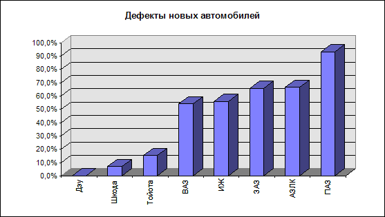 В данной диаграмме сравнивается цена автомобиля 1996 года выпуска и автомобиля выпущенного в 1997 году. На основании этих данных вычисляется процент падения цены. Круговая диаграмма позволяет не только численно, но и визуально оценить соотношение процента падения цены на автомобили разных моделей за один и тот же период.