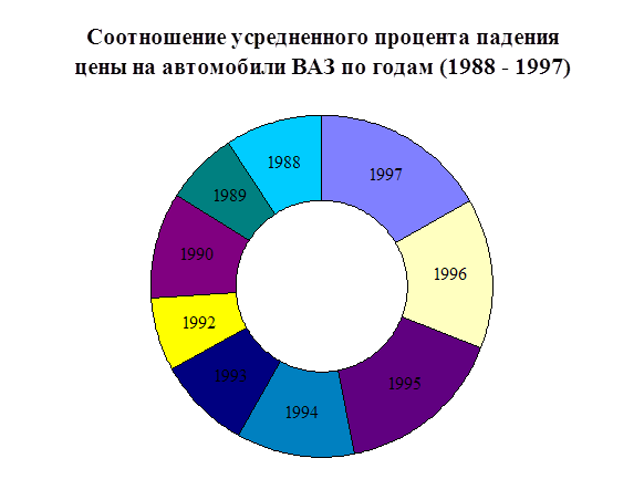 В диаграмме показан средний процент падения цены на автомобили ВАЗ с 1988 года выпуска по 1997 год. Для построения использовалась информация, находящаяся в таблице № 2 « Процент падения цены на автомобили по годам ». Формулу для вычисления процента падения см. в разделе «Формулы». Далее находится среднее значение, и по этим данным строим диаграмму.