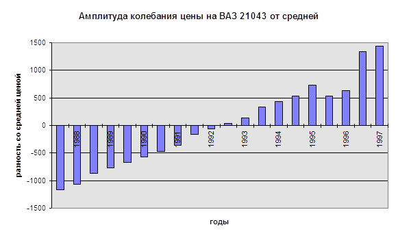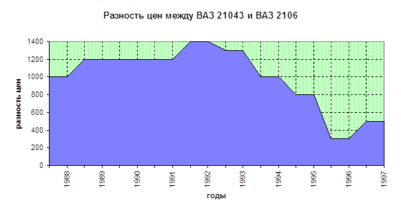 В данной диаграмме показана разность между ценой на ВАЗ 21043 и ВАЗ 2106. С ее помощью наглядно видно, когда разность в цене между этими автомобилями велика, а когда незначительна.