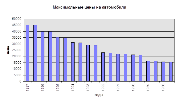 В диаграмме показана цена на самый дорогой автомобиль из всех рассмотренных по годам выпуска.