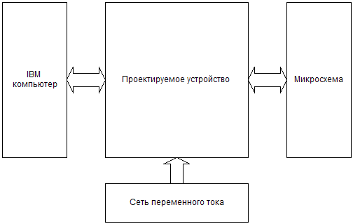 Питание устройства осуществляется от сети переменного тока ~220в, обмен данными между устройством и компьютером осуществляется посредством порта принтера LPT. Микросхема вставляется в колодку, расположенную на корпусе проектируемого устройства.