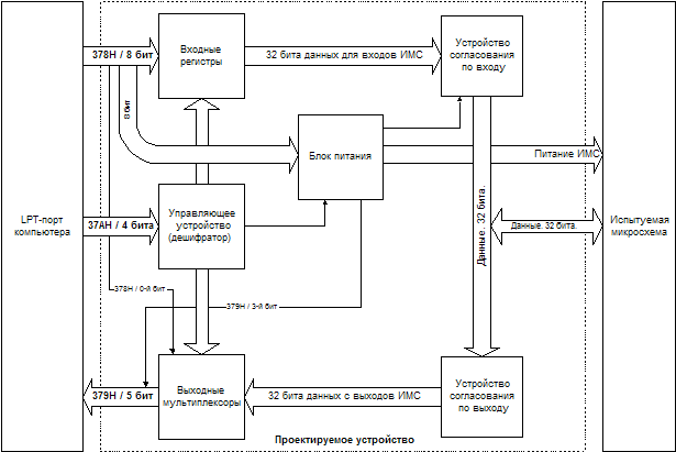 Входные регистры необходимы для запоминания выставленных значений, предназначенных для подачи на вход микросхемы. Выходные мультиплексоры предназначены для чтения сигналов с выходов микросхемы. При проектировании необходимо ориентироваться на 32 разряда (поскольку максимальное число выводов микросхем ТТЛ- и КМОП-логики не превышает 32). Так как число входных и выходных линий LPT-порта ограничено, то наиболее эффективным и удобным для программирования в этом случае будет использование 8-ми выходных линий LPT-порта для записи данных в регистры и 4-х входных линий LPT-порта для чтения данных из мультиплексоров. Для записи данных понадобятся четыре 8-разрядных регистра, для чтения данных - четыре двухвходовых 4-разрядных мультиплексора.
