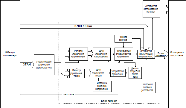 2) 8-разрядный регистр для запоминания выставленного значения напряжения питания испытуемой микросхемы;