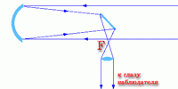У простых зеркальных телескопов, телескопов-рефлекторов, объектив - это сферическое зеркало, которое собирает световые лучи и отражает их с помощью дополнительного зеркала в сторону окуляра - линзы, в фокусе которой строится изображение. Рефлекс – это отражение. Зеркальные телескопы не грешат хроматической аберрацией, так как свет в объективе не преломляется. Зато у рефлекторов сильнее выражена сферическая аберрация, которая, кстати говоря, сильно ограничивает поле зрения телескопа. В зеркальных телескопах так же используются сложные конструкции, поверхности зеркал, отличные от сферических и прочее.