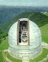 Линзы, так или иначе, всегда используются в телескопе. Но в телескопах-рефракторах линзой является главная деталь телескопа – его объектив. Вспомним, что рефракция – это преломление. Линзовый объектив преломляет лучи света, и собирает их в точке, именуемой фокусом объектива. В этой точке строится изображение объекта изучения. Чтобы его рассмотреть используют вторую линзу – окуляр. Она размещается так, чтобы фокусы окуляра и объектива совпадали. Так как зрение у людей разное, то окуляр делают подвижным, чтобы было возможно добиться четкого изображения. Мы это называем настройкой резкости. Все телескопы обладают неприятными особенностями - аберрациями. Аберрации – это искажения, которые получаются при прохождении света через оптическую систему телескопа. Главные аберрации связаны с неидеальностью объектива. Линзовые телескопы (да и телескопы вообще) грешат несколькими аберрациями. Назовем лишь две из них. Первая связана с тем, что лучи разных длин волн преломляются чуть по-разному. Из-за этого для синих лучей существует один фокус, а для красных – другой, расположенный дальше от объектива. Лучи других длин волн собираются каждый в своем месте между этими двумя фокусами. В результате мы видим окрашенные в радугу изображения объектов. Такая аберрация называется хроматической. Второй сильной аберрацией является аберрация сферическая. Она связана с тем, что объектив, поверхностью которого является часть сферы, на самом деле, не собирает все лучи в одной точке. Лучи идущие на разных расстояниях от центра объектива собираются в разных точках, из-за чего изображение получается нечетким. Этой аберрации не было бы, если бы объектив имел поверхность параболоида, но такую деталь сложно изготовить. Чтобы уменьшить аберрации изготавливают сложные, вовсе не двухлинзовые системы. Дополнительные части вводятся для исправления аберраций объектива. Давно держащий первенство среди линзовых телескопов - телескоп Йеркской обсерватории с объективом 102 сантиметра диаметром.