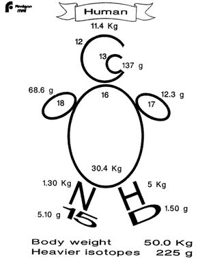 Из чего состоит человеческое тело? Помимо того, что как любая материя человеческий организм сложен из кирпичиков - атомов, атомы одного сорта отличаются количеством элементарных частиц, их составляющих, то есть обладают свойством изотопии. Для для того, чтобы было легче оперировать цифрами, представим себе некоего человека, вес которого составляет 50 кг. Тогда на кислород, углерод, азот и водород приходится в общей сложности 48.3 кг. На все другие элементы – оставшиеся 1.3 кг. Пользуясь таблицей природной распространенности изотопов, легко посчитать, какое количество в таком гипотетическом человеке содержится тех или иных изотопов. Больше всего в человеке кислорода (30.481 кг). Это означает, что изотопа кислорода с массовым числом 16 (обозначается 16О) в человеке 30.4 кг, изотопа с массовым числом 17 (17О) 12.3 г и с массовым числом 18 (18О) 68.6 г. Углерода в нашем человеке 11.537 кг и он распределен между изотопом с массовым числом 12 (12С) – 11.4 кг - и изотопом с массовым числом 13 (13С) – 137 г. Водорода в человеке чуть больше пяти кг: с массовым числом 1 (1Н) 5.0 кг, с массовым числом 2 (2Н или D - дейтерий) 1.5 г. Наконец, изотопы азота с массовыми числами 14 (14N ) и 15 (15N ) содержатся в количествах 1.3 кг и 5.1 г, соответственно. Один из авторов изобразил такого "изотопного человека" в следующем виде: