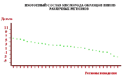 На приведенном графике по оси ординат отложен изотопный состав кислорода в вина (в единицах d 18О), а по оси абсцисс – район виноделия (в порядке убывания d 18О). Пользуясь этим банком данных идентифицируют место происхождения вина или проверяют его маркировку. Более сложная ситуация имеет место в случае нефти: здесь изотопный состав – одна из составляющих банка данных, который содержит кроме этого сведения о биомаркерах и микроэлементах нефти из каждой скважены.