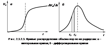 Капиллярная конденсация описывается уравнением Кельвина, в которое входит радиус кривизны мениска. Это позволяет рассчитывать функции распределения пор по размерам. В принципе количественная характеристика дисперсных систем по дисперсности может быть представлена распределением массы, объема, размером частиц по радиусу поверхности. Метод расчета функции распределения частиц (пор) по размерам заключается в построении интегральных и дифференциальных кривых распределения. Для простых тел наиболее типичными является распределение пор по радиусу. Поэтому интегральная кривая распределения выражает зависимость общего объема пор от их радиуса: Vn=f(r).