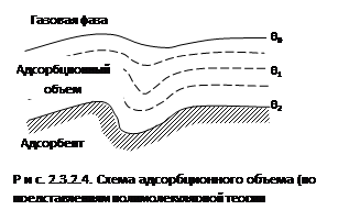 3. Адсорбционные силы действуют на расстоянии большем, чем монослой адсорбата, поэтому говорят об абсорбционном объеме, который заполняется жидким адсорбатом.