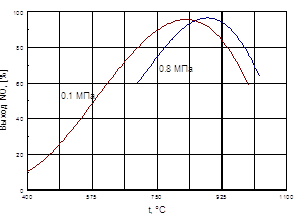 В соответствии с вышесказанным единственным путем получения больших выходов NO является увеличение скорости основной реакции по отношению к побочным. В соответствии с уравнением Аррениуса увеличение константы скорости можно добиться с помощью увеличения температуры или уменьшения энергии активации реакции. Константа скорости будет быстрее расти у тех реакций, у которых больше энергия активации.