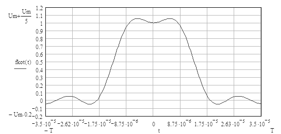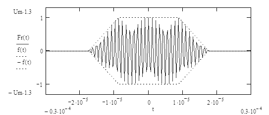 Данный ряд называется рядом Котельникова и позволяет полностью восстановить аналоговый сигнал fa(t) из дискретных выборок этого сигнала, если сигнал fa(t) имеет ограниченный спектр с максимальной частотой fg, и если выборки взяты с частотой не меньшей 2fg. Поскольку сигнал, подвергнутый дискретизации (3.2), имеет неограниченный спектр (3.5), то восстановление сигнала (3.26) по его выборкам (3.23), будет неточным. Уменьшить ошибку до любого уровня можно увеличивая частоту дискретизации. Сигнал восстановленный с помощью выражения (3.26), приведен на рисунок 3.11.