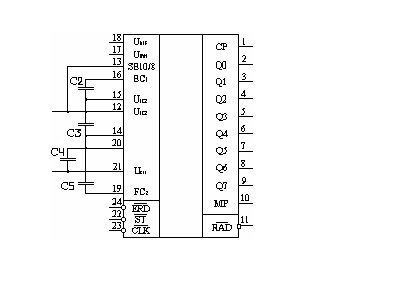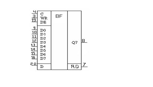 Преобразователь параллельного цифрового кода в последовательный код построен на базе микросхемы Hitachi MBF1250. Микросхема Hitachi MBF1250 – это буфер типа FIFO(First Input First Output) с размером матрицы 128Кx8 и, по сути дела представляет собой последовательно соединённые параллельные восьмиразрядные регистры сдвига. Микросхема работает в двух режимах: когда на входе управления появляется сигнал высокого уровня, он запускает первый генератор, систему управления АЦП, при этом происходит запись восьмиразрядных кодов из АЦП в буфер; во втором режиме, когда сигнал управления сообщает об отсутствии информации на входе АЦП, происходит остановка работы первого генератора и самого АЦП, при этом запускается второй генератор, синхронизирующий работу буфера, производящего выгрузку данных. Назначение выводов: