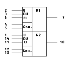 ( Ucc = 5,25 В; U1вых ³ 2,7 В; U0вых £ 0,5 В; Iпотр £ 0,5 мА; I0вх ³ -0,4 мА; I1вх £ 0,02 мА;
