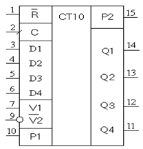 Вывод P1 используется для разрешения переноса импульса в следующий каскад (если соединяются несколько счетчиков последовательно). У нас только один счетчик поэтому на вывод P1 должно постоянно подаваться напряжение высокого уровня. На вход разрешения счета V1, в зависимости от режима работы АЦП, подаётся напряжение с сигнала управления. Высокий уровень разрешает работу счетчика, низкий блокирует. Выход R также подсоединяем к СУ. Низкий уровень обнулирует счетчик.