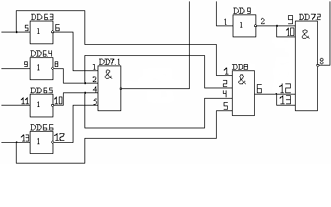 Четырехразрядный код с двоично-десятичного счетчика подается на логические элементы. Если код равен нулю, то срабатывает первый элемент “И” (DD3.1) и импульс подается на АЦП, на вход запуска ST. Так как с элемента “И” (DD3.1) импульс идет не инвертированный, то перед ST необходимо поставить инвертор – логический элемент “НЕ” (DD2.5).