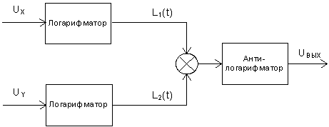 Структурная схема перемножителя логарифмического типа приведена на рисунке 1.1. В данной схеме используются логарифмические и антилогарифмический усилители. Схема обеспечивает логарифмирование входных сигналов Х и У с их последующим суммированием и потенцированием (антилогарифмированием) этой суммы. В результате по законам логарифмирования получается сигнал, пропорциональный произведению двух входных сигналов.