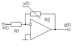 Аналоговые перемножители, построенные на основе управляемых сопротивлений, имеют общий принцип построения: один из сигналов подаётся на вход операционного усилителя, в цепи обратной связи которого находится термистор, фоторезистор или управляемое сопротивление сток-исток полевого транзистора, управление сопротивлением которого происходит вторым сигналом (рис. 1.2).