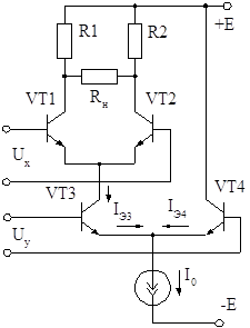 По своему действию дифференциальный каскад на транзисторах VT1 и VT2 (рис. 2.1) подобен усилителю с общим эмиттером, только токи эмиттеров указанных транзисторов не зависят от входных напряжений. Нетрудно заметить, что разность токов коллекторов транзисторов VT1 и VT2 пропорциональна не только входному дифференциальному напряжению UX, но и току эмиттера транзистора VT3 - IЭ3. Ток IЭ3 можно регулировать подачей напряжения между базами транзисторов VT3 и VT4. Если резисторы R1 и R2 равны, то напряжение на сопротивлении RН может быть представлено следующим образом: