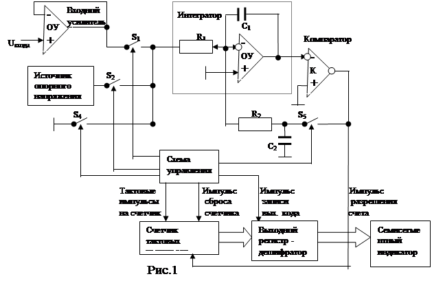 Принцип работы АЦП поясняется с помощью диаграммы на рис.2. Работа начинается с замыкания ключа S1 соответствующим сигналом схемы управления (методичка стр.21). При наличии на входе напряжения, отличного от 0 начинается заряд конденсатора С1 интегратора. (Для определенности считаем, что входное напряжение есть и отрицательно. Входной усилитель в данной схеме играет роль повторителя напряжения. Он необходим для исключения влияния АЦП на измеряемую цепь и в процессе АЦ преобразования самостоятельной роли не играет) Обозначив время 1го такта работа АЦП