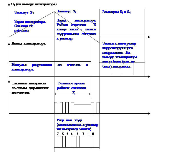 Нужно заметить, что в процессе работы выход ОУ интегратора “ведет” себя так, что бы напряжение на инверсном входе было нулевым. Т.е. выход ОУ станет положительным в самом начале процесса интегрирования. При этом компаратор сразу выдаст на счетчик разрешающий сигнал. Однако, счет не начнется, поскольку импульсы со схемы управления в этом такте еще не поступают.