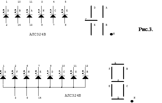 Для индикации результатов измерения рекомендовано использовать 7 сегментные индикаторы типа АЛС342Б (3 мл. разряда) АЛС324В (1/2 4го разряда) (5 стр.165). Цоколевка и расположение сегментов индикаторов приведена на рис.3.