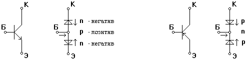 На рис.1 и 2 показаны условные графические обозначения кремниевых (n-p-n) и германиевых (p-n-p) транзисторов и соответствующие им диодные схемы замещения.
