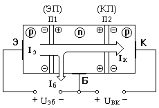 Таким образом образуется эмиттерный ток (Iэ) через соответсвующий переход (ЭП- эмиттерный переход).