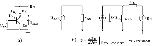 При анализе основных схем включения транзисторов (здесь ОЭ, а далее ОБ и ОК) воспользуемся упрощенным (эквивалентным) представлением биполярного транзистора для низких частот, изображенном на рис.5. б.