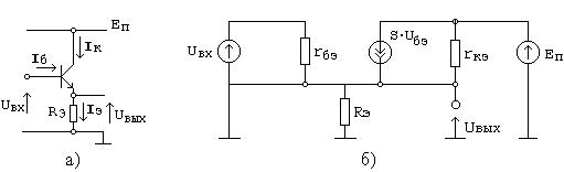 Рис.5. Включение транзистора по схеме с ОЭ (а) и эквивалентная схема (б) для данного случая.