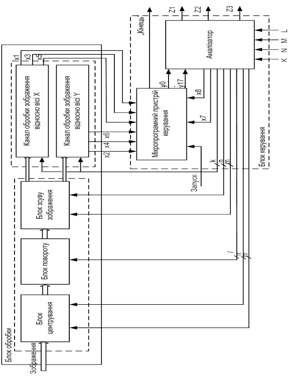 Особливістю блока керування для даної системи є можливість виконання ним не тільки функцій керування, але й попередньої обробки інформацій про вхідний відеосигнал, в результаті чого формуються ознаки симетричності зображення.