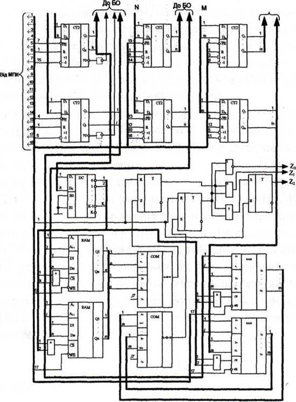 Чотири схеми ОЗП RAM використовуються для зберігання величини зсуву вздовж осей X i Y відповідно до комплекту масок при певних кутах повороту, причому, адреса комплекту масок використовується для вибору необхідної мікросхеми ОЗП, а адреса кута повороту є адресою, за якою записується певна інформація з відповідних лічильників в ОЗП.