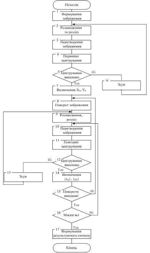 Для обробки вхідного відеосигналу з подальшим формуванням еталонів попередньо здійснюють первинне та повторні центрування за моментними ознаками, які реалізовані за допомогою способу розпізнавання симетричних зображень об'єктів, блок-схема алгоритму якого показана на додатку Д. Процедура, що подається в кожній операторній вершині даної блок-схеми, відповідає макрооперації, реалізованій у системі розпізнавання (14,15).