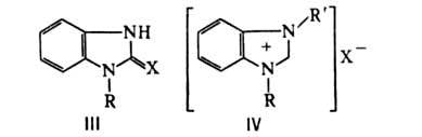 С ионами некоторых металлов (Ag, Co, Си и др.) бензимидазол образует в аммиачном р-ре соли. Бензимидазол устойчив к действию окислителей, но СrO3 в 80%-ной H2SO4 при 80°С окисляет его до имидазол-4,5-дикарбоновой к-ты. Сплавление с S превращает бензимидазол в бензимидазол-2-тион, 1-алкилбензимидазолы - в его 1-алкилзамещенные (формула III, X = S, R = А1К). Б. алкилируется алкилгалогенидами и диалкилсульфатами в присут. щелочей в положение 1. При алкилировании N-алкилбензимидазолов образуются соли 1,3-диалкилбензимидазолия (формула IV). Арилирование бензимидазола в положение 1 с помощью галогенаренов протекает обычно в жестких условиях. Действием ацилхлоридов и ангидридов кислот получают N-ацилпроизводные. Бензимидазол нитруется смесью HNO3 и H2SO4 в положение 5. При сульфировании образуется 5(6)-сульфокислота. Нуклеофильное замещение протекает в положении 2 лишь с N-производными Б. При нагревании с NaNH2 в диметиланилине образуются 2-аминопроизводные Б., при сплавлении с КОН-бензимидазолоны (ф-ла III, X = О). Металлирование (например, фенилнатрием) идет в положение 2.