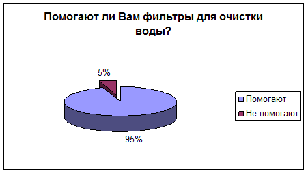 Итак, проанализировав полученные данные можно сделать вывод: большинство опрошенных людей пользуются фильтрами для воды и они им помогают очищать воду, посещают и положительно относятся к Святым источникам воды 80 % опрошенных, про лечение талой водой знают немногие, верят в свойства крещенской воды 95 % опрошенных. Опрос показал, что еще многим людям нужно разъяснять о качестве воды и как ее сделать качественной. Может быть, это должны быть специальные программы по ТВ или статьи в газетах для просвещения людей.