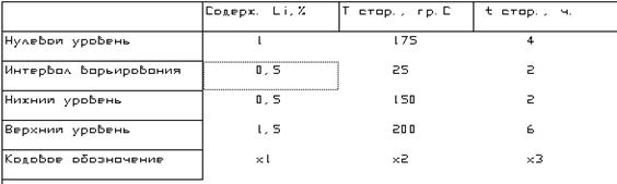 Изучали механические свойства одного из алюминиевых деформируемых сплавов в зависимости от содержания в нем лития Х1 (основной уровень 1%, интервал варьирования 0,5%), температуры старения Х2 (основной уровень 175 гр.С, интервал варьирования 25 гр.С) и времени старения Х3 (основной уровень 4 ч., интервал варьирования 2 ч.). В качестве отклика выбран предел прочности сплавов, определяющийся при испытании на растяжение (Y, кгс/кв.мм).