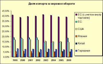 Во-первых, за исключением трех лет «провала» (с 2003 по 2005 годы) относительная доля Евросоюза в мировом импорте превышала соответствующую долю для США. И если ЕС удалось в 2006 году вновь значительно нарастить импорт, то доля США так и осталась на уровне примерно в 15%. При этом если учитывать еще и торговлю между странами внутри Евросоюза, то получается, что за рассматриваемый срок доля региона в совокупном импорте практически не менялась и оставалась около отметки в 40%.(все расчеты проводились в долларах в текущих ценах).