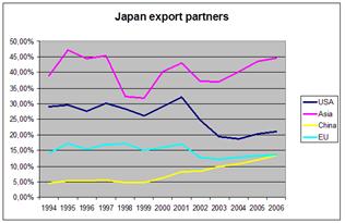 Что касается Японии, то доля экспорта в Азию за последние годы выросла при значительном снижении экспорта в США: с 29% в 1994 году до 21% в 2006. Также, Китай догнал ЕС по доли экспорта, что опять же свидетельствует о росте внутреннего спроса в Китае.